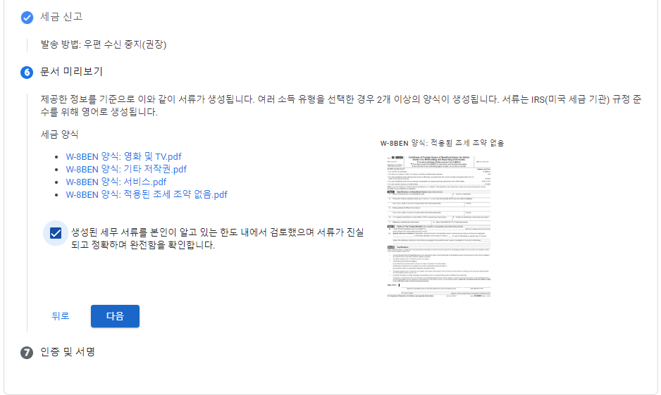 W-8 BEN 양식을 선택해서 다음 버튼을 과감하게 누르면 된다.