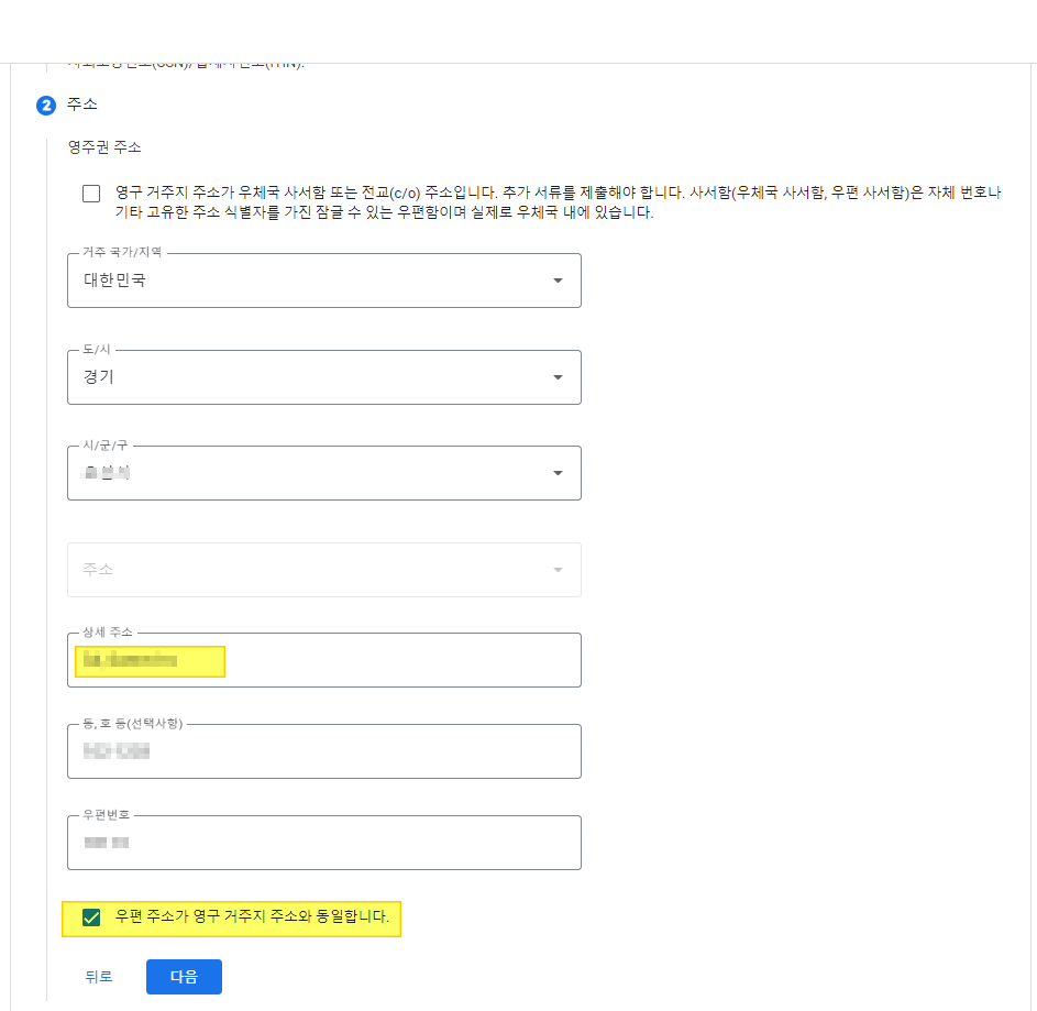 맨 아래 영구 거주지 주소와 동일하다는 체크박스를 체크하고 다음을 누른다.