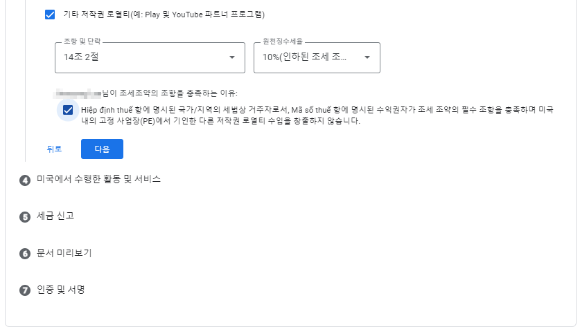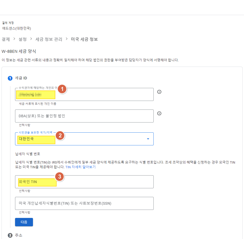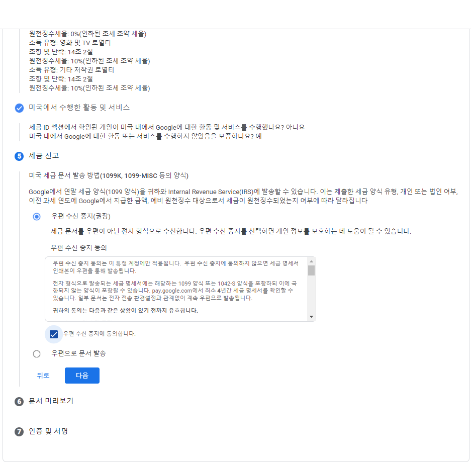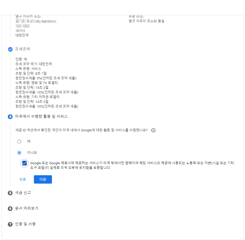 애드센스 지급을 받기 위해서는 미국 세금 정보도 추가로 입력해야 한다. 기본적으로는 미국에서 수입을 버는 사업장이 있지 않다면 크게 어렵지 않게 신청할 수 있다.