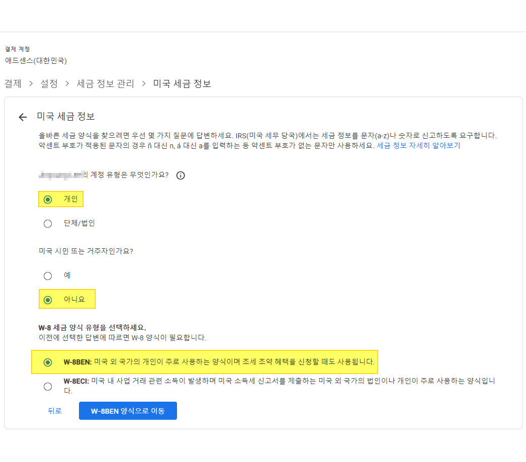 - 세금 정보 관리 페이지에서, 자신의 세무 상황에 맞는 양식을 선택합니다.
