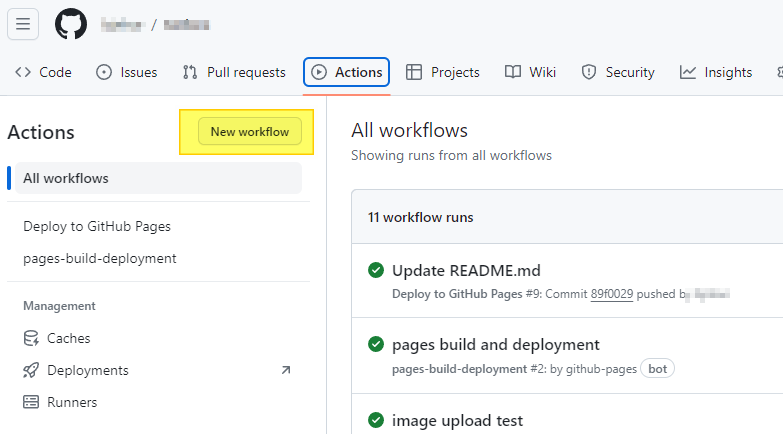 직접 파일로 만들어도 되고, 아니면 아래 그림처럼 저장소에 "Actions" 탭에서 New workflow 를 선택하고 생성해도 된다.