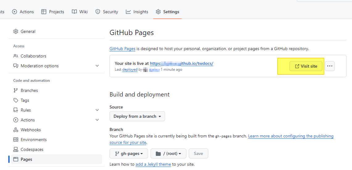 몇분 기다린뒤에 다시 "Settings" > "Pages" 로 방문해 보면 아래와 같이 주소가 정상적으로 맵핑되어 있음을 확인할 수 있다. 그럼 이제 자신만의 문서 사이트를 개시할 준비는 다 되었다.