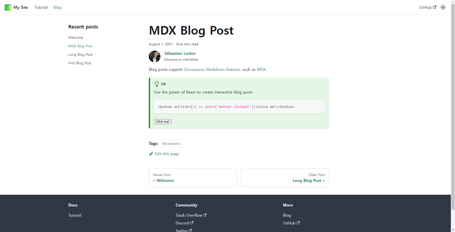 아래와 같이 마크다운을 활용해서 쉽게 문서 페이지를 만들거나, 계층 구조를 만들기만 하면 온라인에서 아래와 같이 문서 사이트처럼 보여지고, 특별하게도 블로그를 따로 구현할 필요없이 해당 기능도 아래와 같이 제공된다.