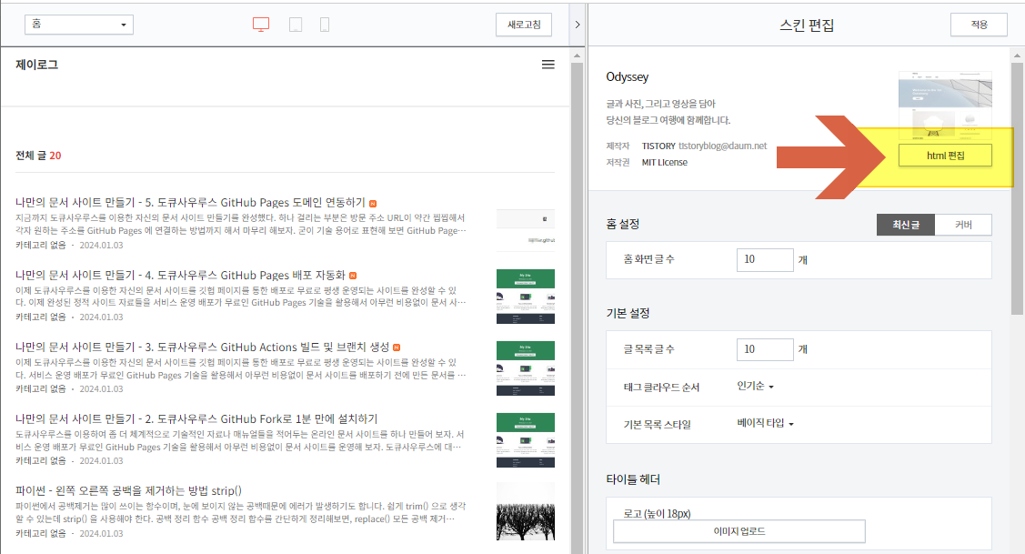 이제 이 코드를 오디세이 티스토리 스킨이 추가해 보자.