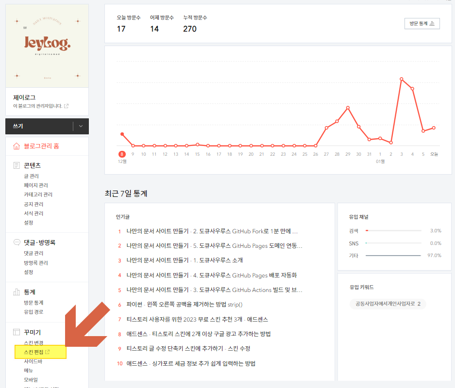 티스토리 스킨을 수정하려면, 관리자 모드에서 스킨 편집으로 가면 된다.