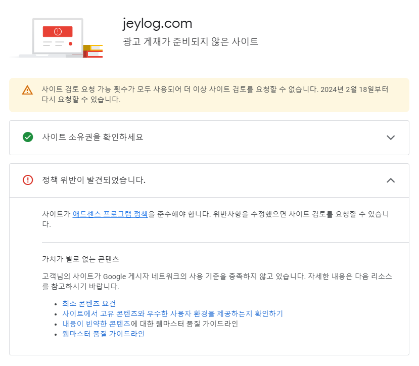 몇번 신청을 했더니 애드센스에서 횟수 제한이라는 메시지가 등장하였다. 알아서 기간을 벌어주는 효과가 발생해 버렸네 그동안 글만 많이 써두고 방문자 수가 늘도록 많은 노력을 해야겠다.