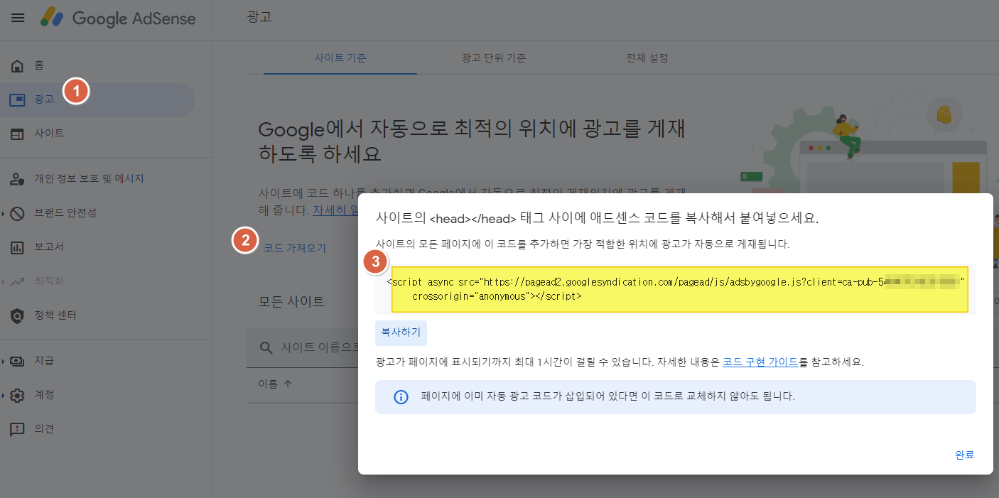 아래 그림처럼 Adsense 페이지에 들어가면 광고>코드 가져오기>복사하기 를 통해서 애드센스 적용 코드를 가져올 수 있다.