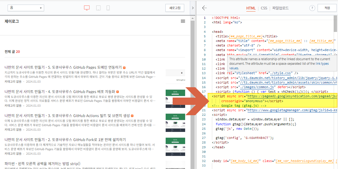 아래 화면처럼 HTML 수정화면에서 받아온 애드센스 코드를 추가하고 저장을 누르면 자신의 티스토리에 반영이된다.