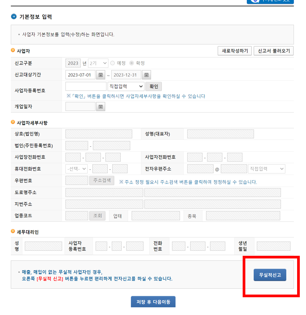 2) 기본정보 입력 후, 하단에 무실적신고 버튼을 누르고, 저장후 다음이동!