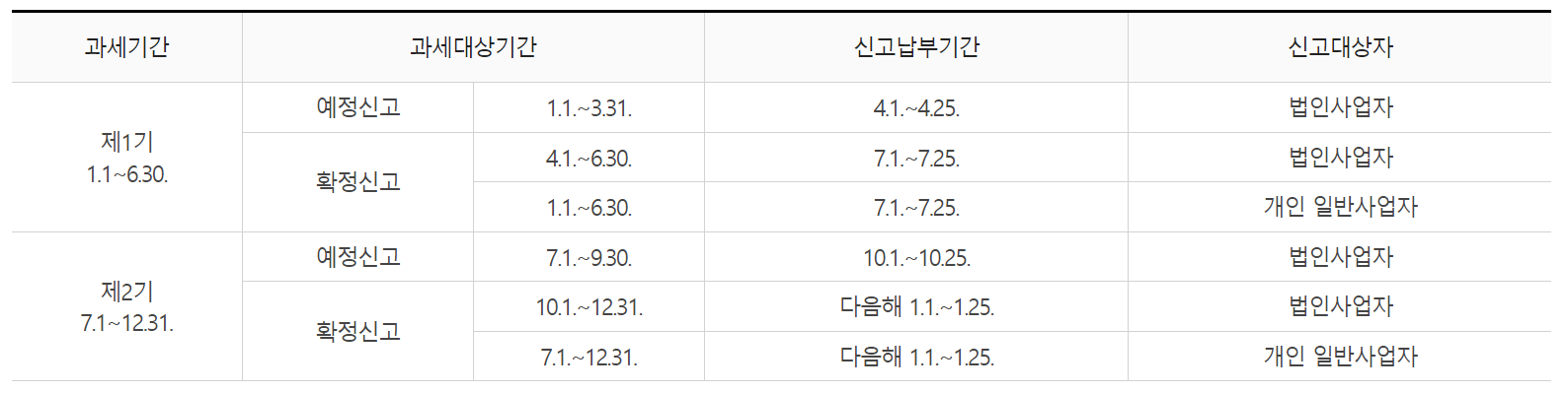 부가세는 기본적으로 6개월을 과세기간으로 하여 신고/납부하며, 매출 규모에 따라 각 과세기간을 다시 3개월로 나누어 중간에 예정신고기간을 두고 있어요.
