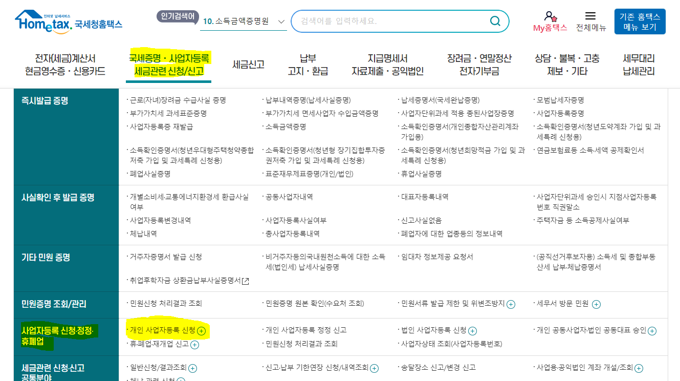 홈택스에서 개인사업자등록 하기
